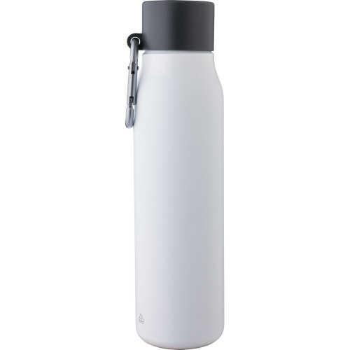 Butelka termiczna 600 ml, uchwyt ułatwiający przenoszenie, utrzymuje temperaturę napojów – ciepłych do 6 godzin, zimnych do 9 godzin, na przedniej części ikona aluminium z recyklingu na produkcie, pakowana pojedynczo w brązowe kartonowe pudełko, wnętrze wykonane ze stali nierdzewnej 304, zewnętrzna warstwa ze stali nierdzewnej 201,szczelna czarna nakrętka z PP, aluminiowy karabińczyk