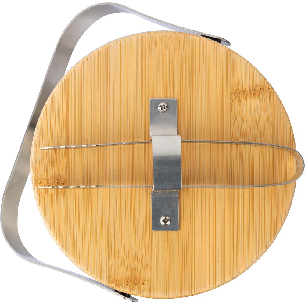Wiaderko do lodu, cooler, posiada podwójne ścianki ze stali nierdzewnej, co spowalnia oddawanie temperatury na zewnątrz, zawiera szczypce do lodu, pojemność 1200 ml, pakowany pojedynczo w brązowe kartonowe pudełko, wnętrze wykonane ze stali nierdzewnej 304, zewnętrzna warstwa ze stali nierdzewnej 201, pokrywka z bambusa, stalowy uchwyt do przenoszenia