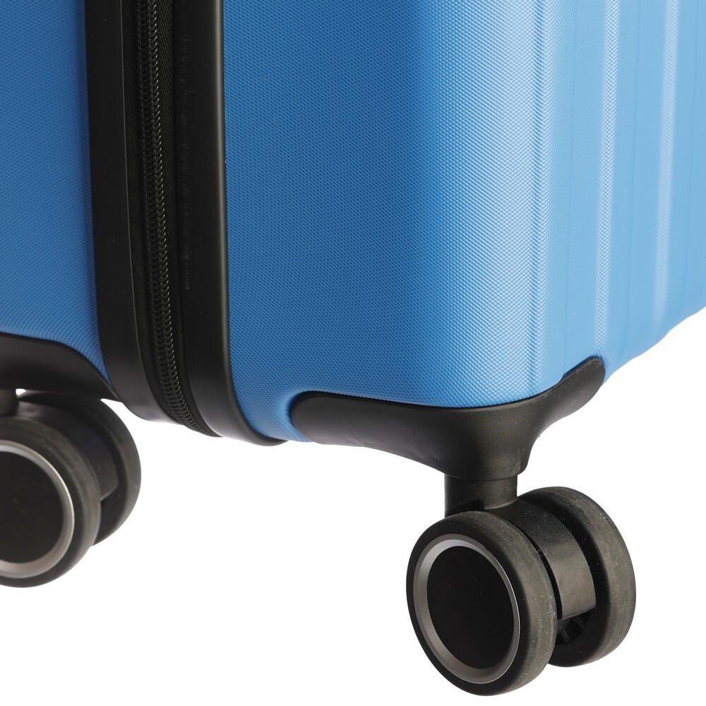 Walizka, torba na kółkach z twardą obudową, 8 kółek obrotowych (4x2), trzypoziomowy metalowy uchwyt, górny uchwyt z tworzywa sztucznego, zamek szyfrowy (nie-TSA), tabliczka do grawerowania z taśmą 3M, posiada trzy przegrody: kieszeń na suwak w kształcie litery U, kieszeń z siatki oraz pasy krzyżowe z klamrą, pojemność: 30L, pakowana pojedynczo w brązowe kartonowe pudełko, produkt wykonany z ABS, wnętrze wyłożone materiałem 210D