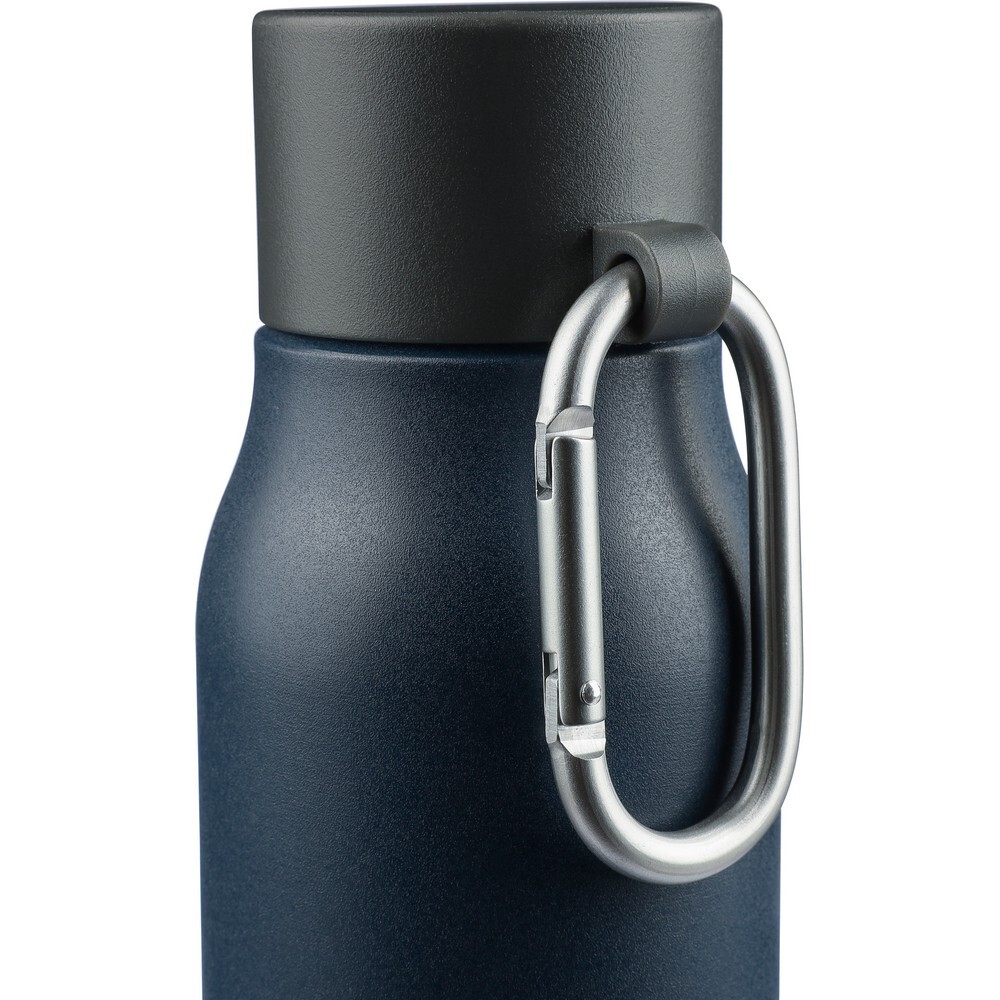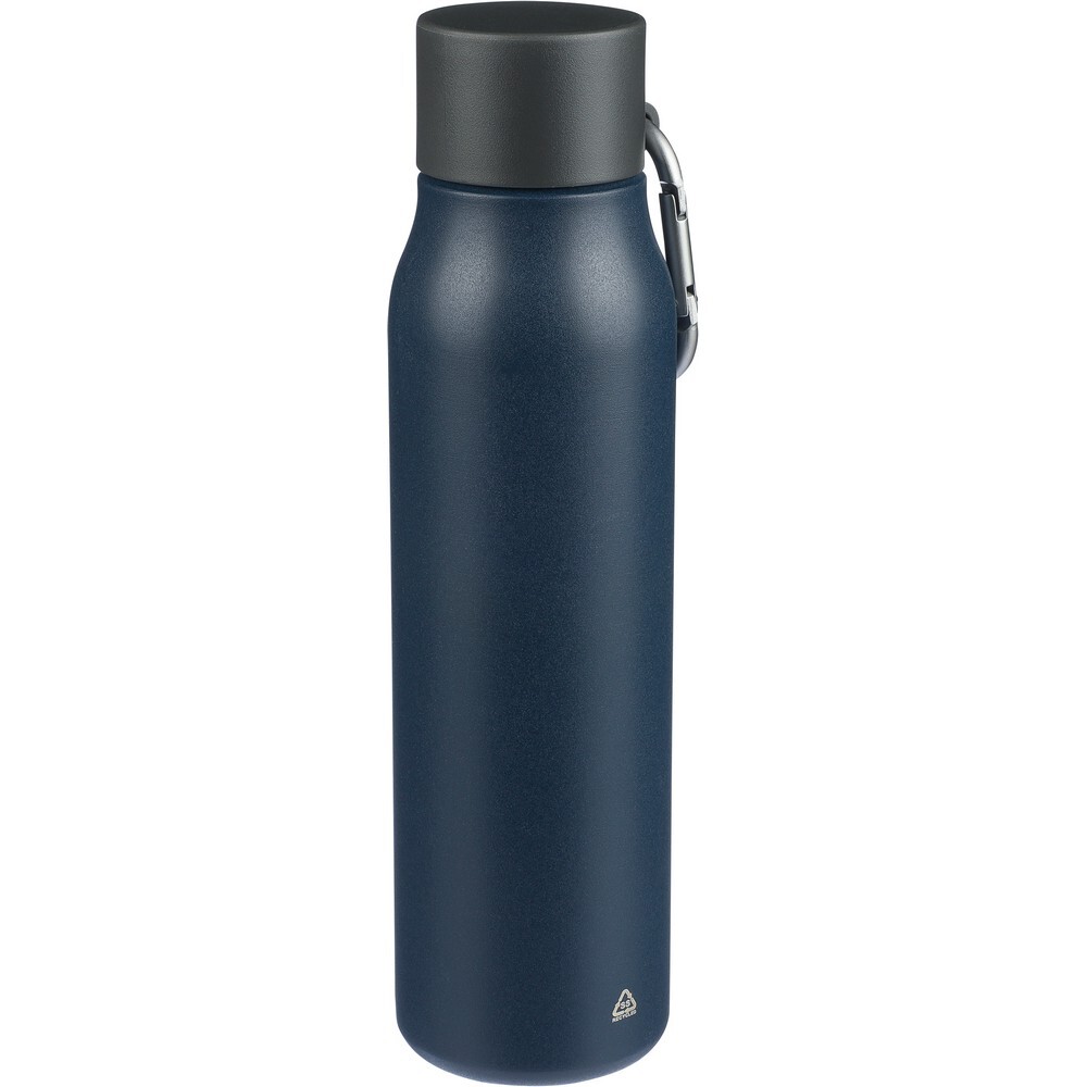 Butelka termiczna 600 ml, uchwyt ułatwiający przenoszenie, utrzymuje temperaturę napojów – ciepłych do 6 godzin, zimnych do 9 godzin, na przedniej części ikona aluminium z recyklingu na produkcie, pakowana pojedynczo w brązowe kartonowe pudełko, wnętrze wykonane ze stali nierdzewnej 304, zewnętrzna warstwa ze stali nierdzewnej 201,szczelna czarna nakrętka z PP, aluminiowy karabińczyk