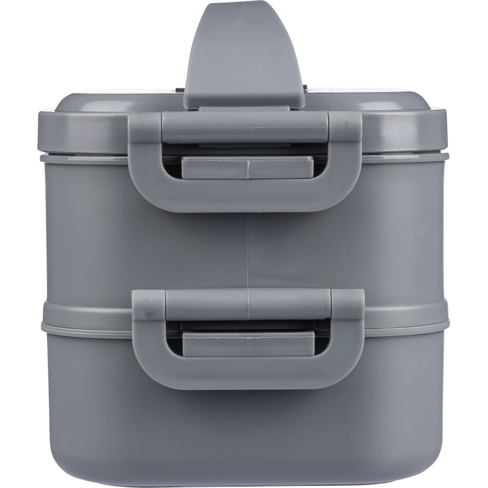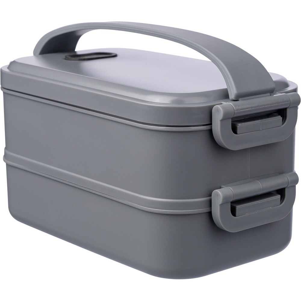 Pudełko śniadaniowe o łącznej pojemności 1600 ml, podzielone na dwie warstwy po 800 ml, posiada silikonowy zawór odpowiedni do użytku w kuchence mikrofalowej, zamknięcie na klamrę, silikonowy uchwyt do przenoszenia, pudełko nie nadaje się do mycia w zmywarce, pakowane zbiorczo, produkt wykonany z PP