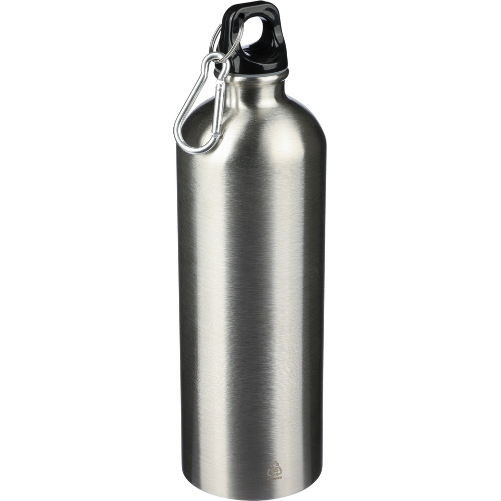Butelka sportowa 750ml, jednowarstwowa, ikona recyklingu na produkcie, nie nadaje się do mycia w zmywarce, produkt wykonany ze stali nierdzewnej z recyklingu, nakrętka z PP, srebrny aluminiowy karabińczyk