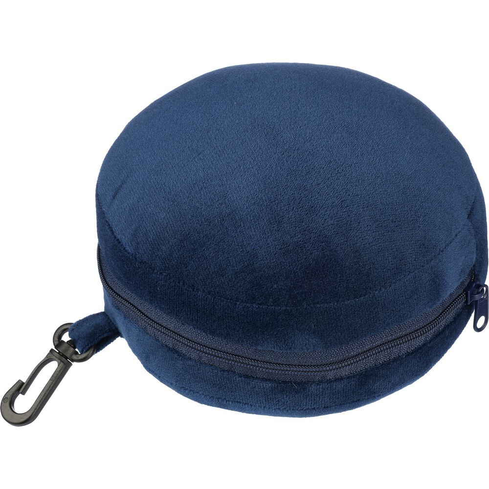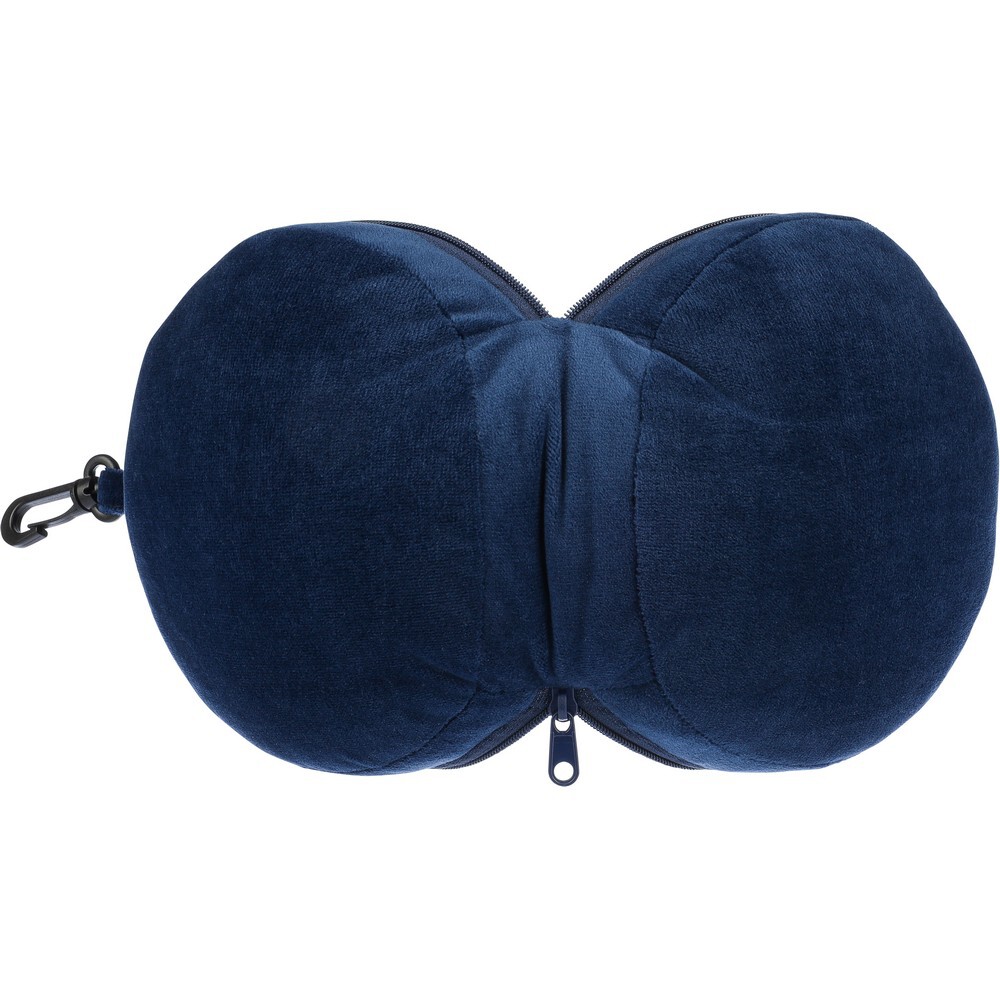 Poduszka podróżna, zawiera opaskę na oczy, po rozpięciu zamienia się w poduszkę, wyposażona w karabińczyk, umożliwiający łatwe przymocowanie podczas podróży, wykonana z miękkiego poliestru i wypełniona bawełną PP