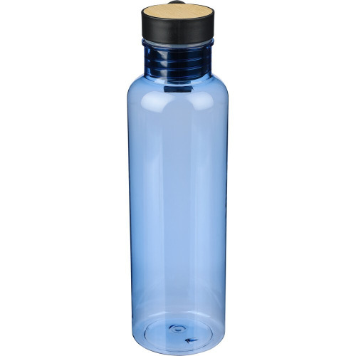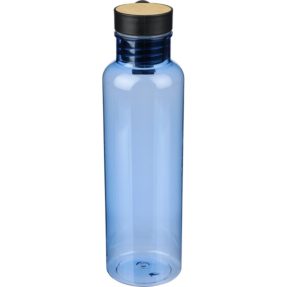 Butelka sportowa 750 ml, ozdobiona bambusowym detalem na górze, silikonowy pasek do przenoszenia, nie nadaje się do mycia w zmywarce, indywidualnie zapakowana w torebkę foliową z recyklingu, produkt wykonany z RPET, nakrętka z PP