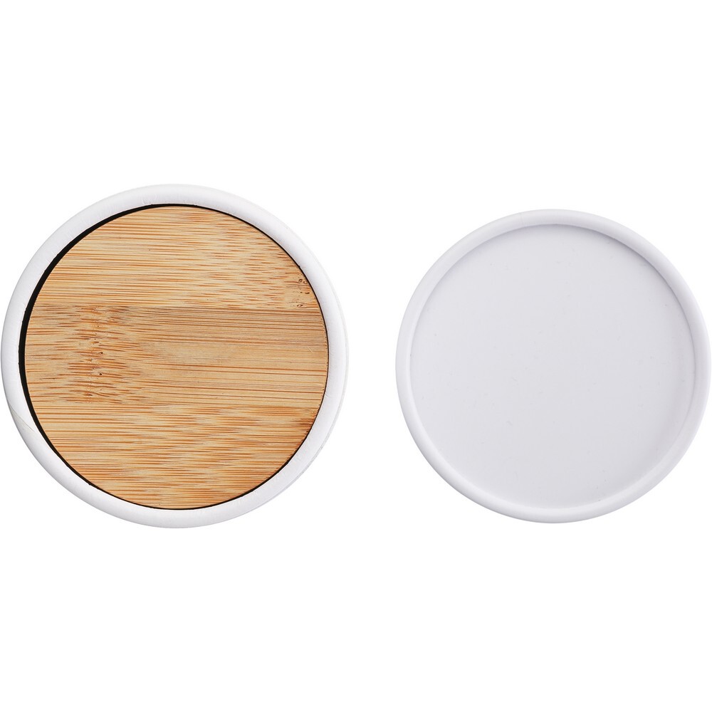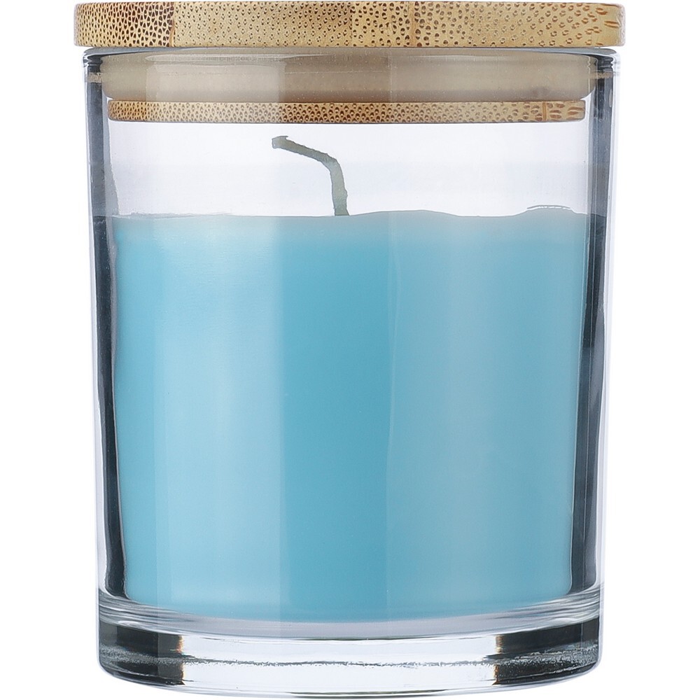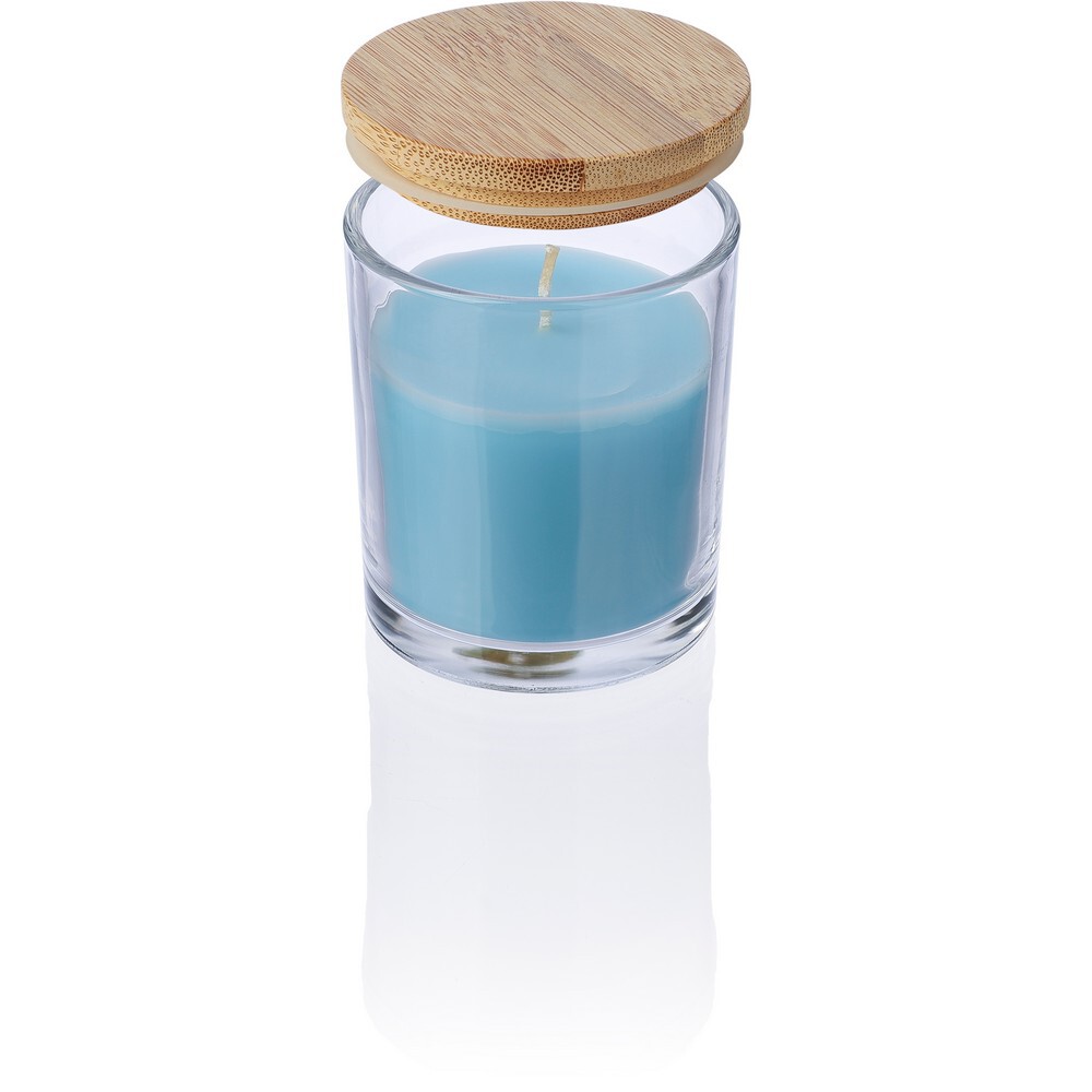 Świeczka zapachowa z 120 gramami kolorowego wosku o zapachu waniliowym, umieszczona w przezroczystym szklanym pojemniku z bambusową pokrywką, czas palenia wynosi około 20 godzin, indywidualnie zapakowana w białą kartonową tubę