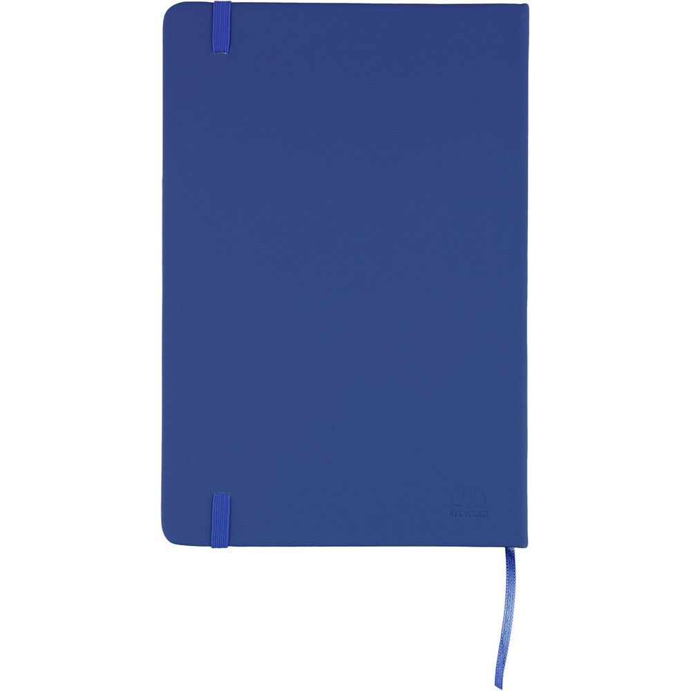 Notatnik ok. A5 RPET, z twardą okładką wykonaną z RPET PU, zawierający 80 stron w linie (70 g/m²), tasiemka zakładkowa umożliwia wygodne zaznaczanie ostatniej strony lub ważniejszych notatek, dodatkowe zamknięcie w postaci kolorowej elastycznej opaski, ikona recyklingu na tylnej stronie