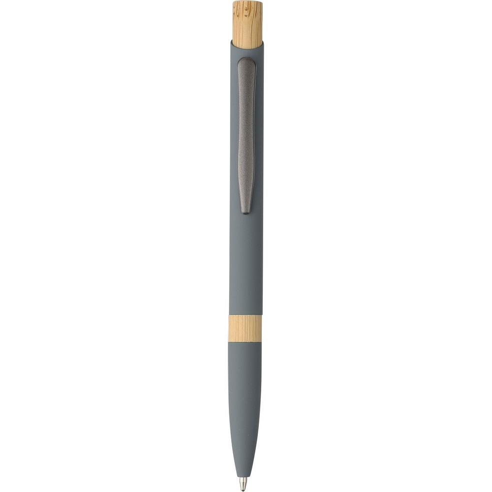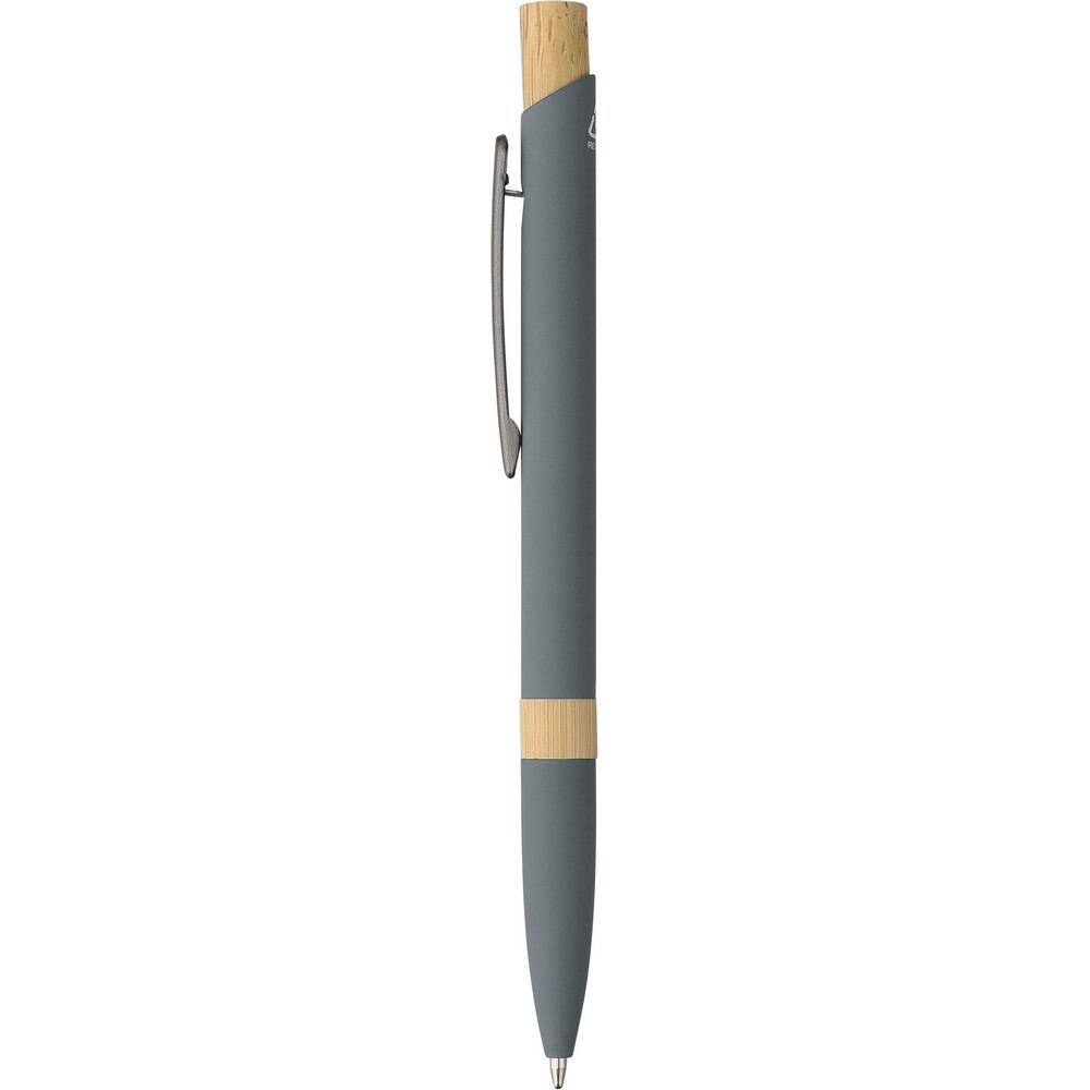 Długopis z aluminium z recyklingu, z gumowaną powłoką, bambusowym przyciskiem i bambusowym pierścieniem w korpusie, wyposażony w mechanizm przyciskowy, wkład o grubości 1,0 mm oraz niebieski tusz o szacunkowej długości pisania 800 metrów, ikona aluminium z recyklingu na produkcie
