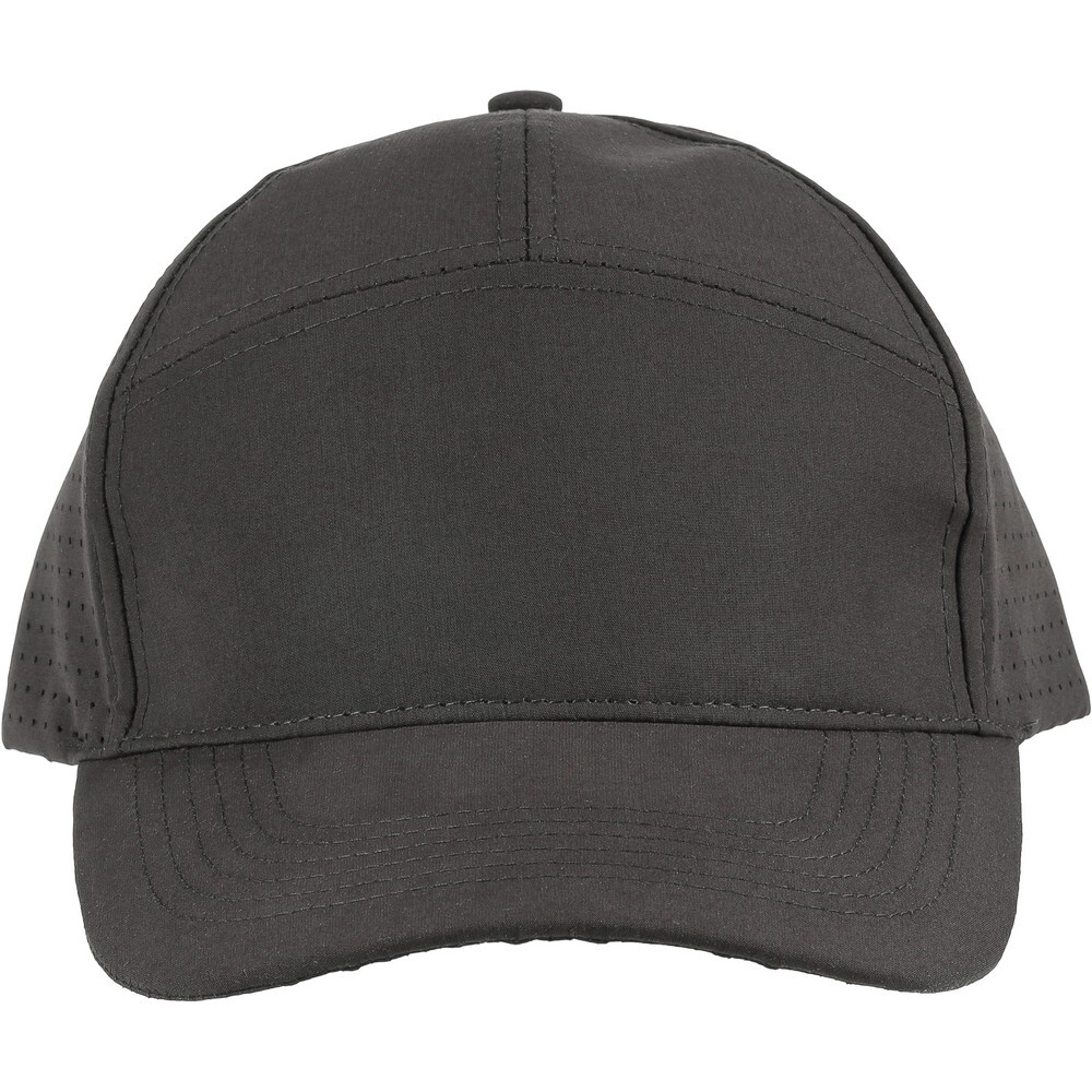 Czapka z daszkiem z laserowo wyciętymi otworami wentylacyjnymi na tylnych panelach, posiada 7-panelową konstrukcję z jednym panelem z przodu oraz daszek o długości 7 cm, regulowana i oddychająca, bez etykiety PU, produkt wykonany z poliestru