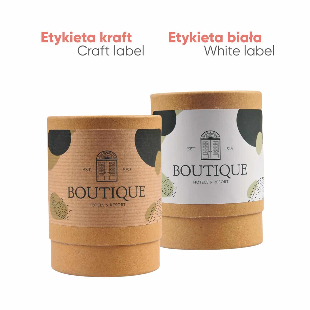 Opakowanie personalizujemy przy wykorzystaniu nadruku cyfrowego na etykiecie samoprzylepnej z papieru białego lub kraft.