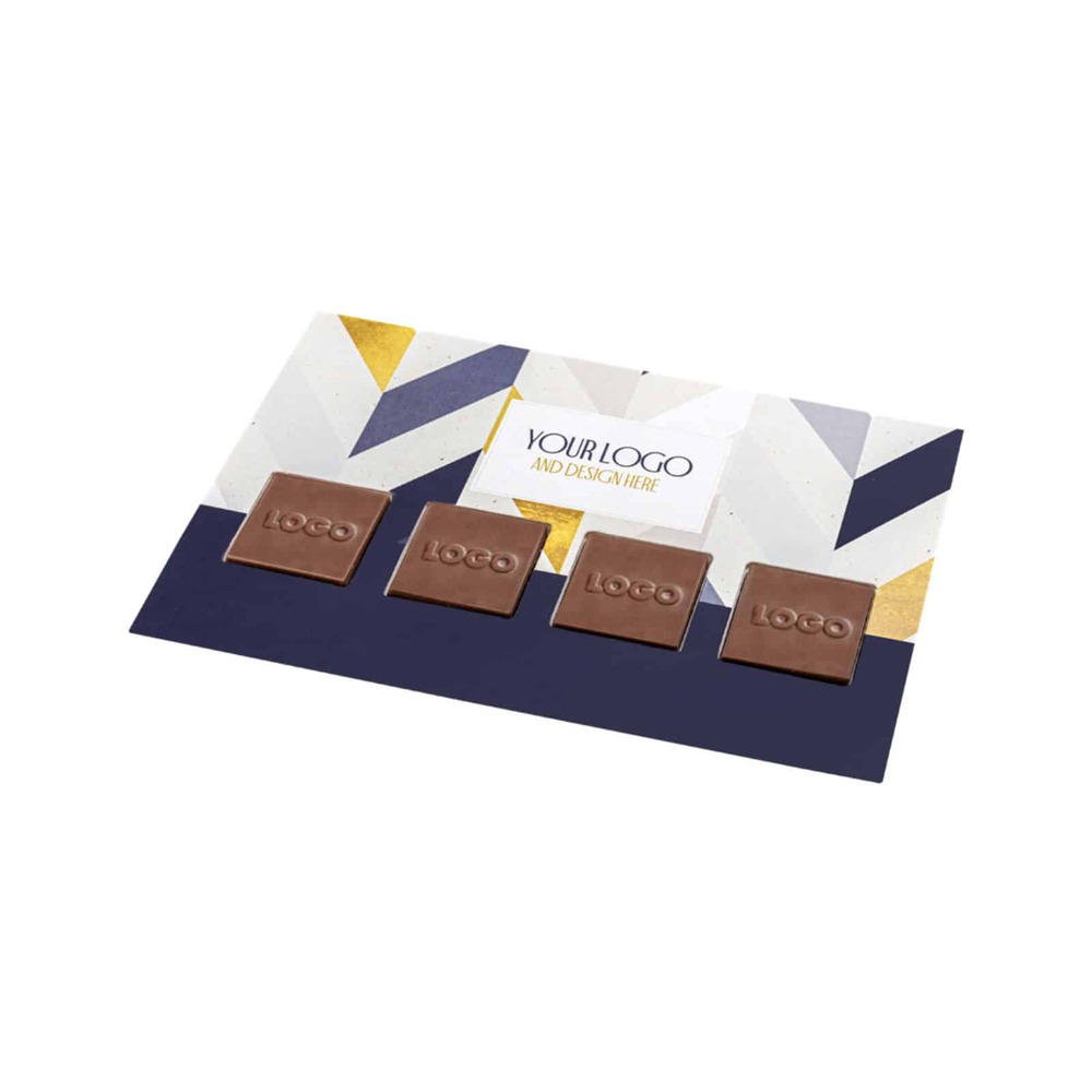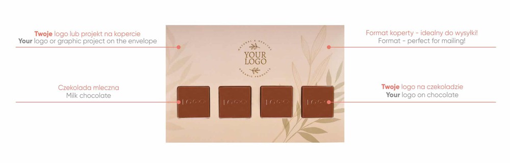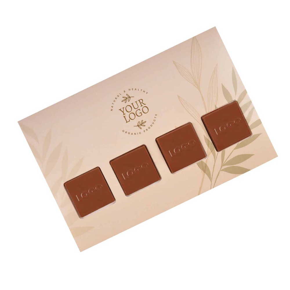 Zestaw 4 czekoladek kształtowych w formie kwadratu z wytłoczonym logo bezpośrednio na czekoladzie, w kopercie o pocztowym rozmiarze… Ten produkt aż prosi się o wysyłkę!