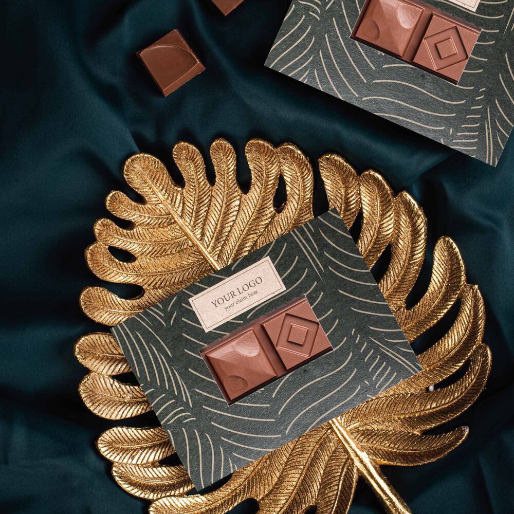 Czekolada zapakowana jest w folię kompostowalną, co w połączeniu z papierem daje opakowanie w pełni biodegradowalne i przyczynia się do tego, że Twoja marka jest postrzegana jako proekologiczna.
