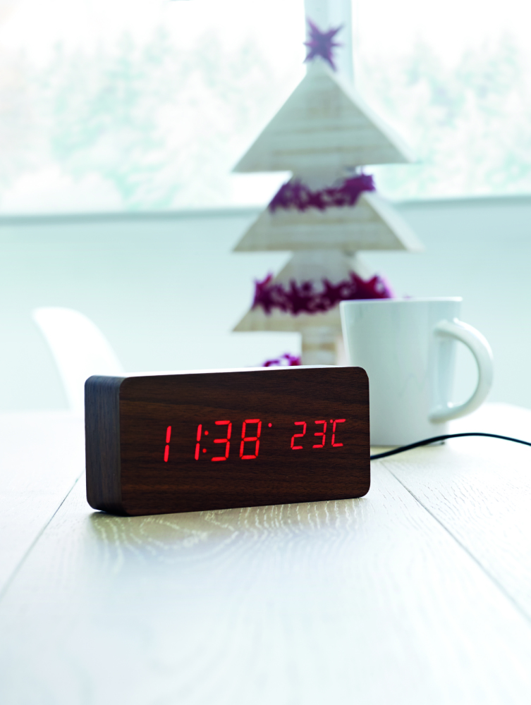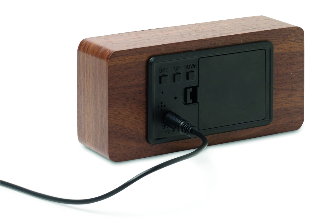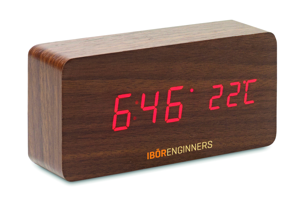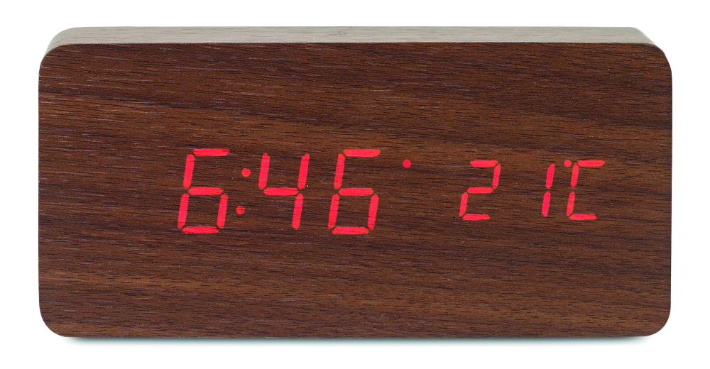 Ledowy zegar z alarmem wykonany z MDF, posiada wskaźnik temperatury. Adapter prądu stałego i zmiennego AC/DC w zestawie.