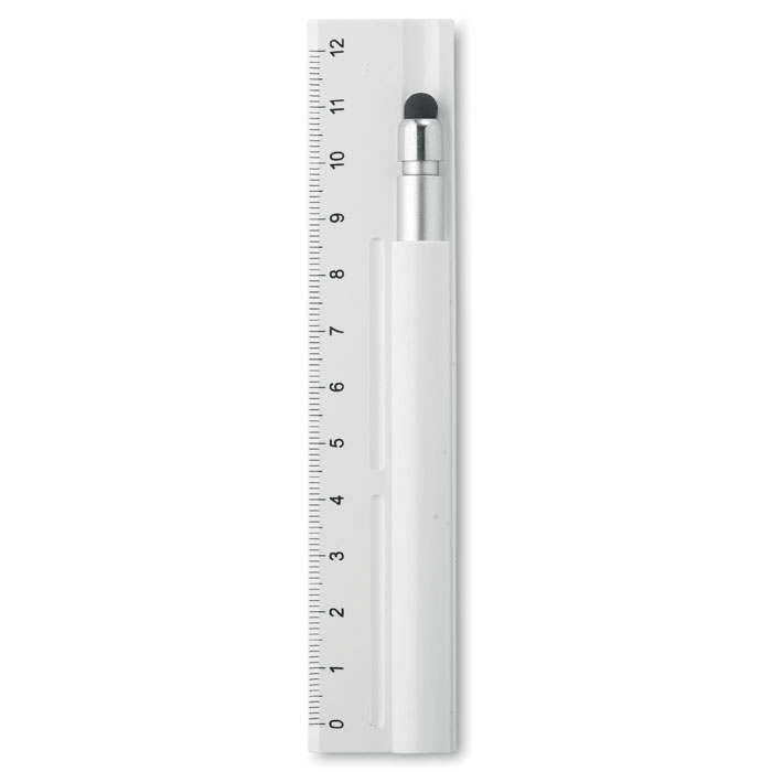 12 cm linijka wykonana z tworzywa sztucznego. Dołączony długopis z matowym metalicznym wykończeniem oraz miękką końcówką do ekranów dotykowych. Niebieski wkład.
