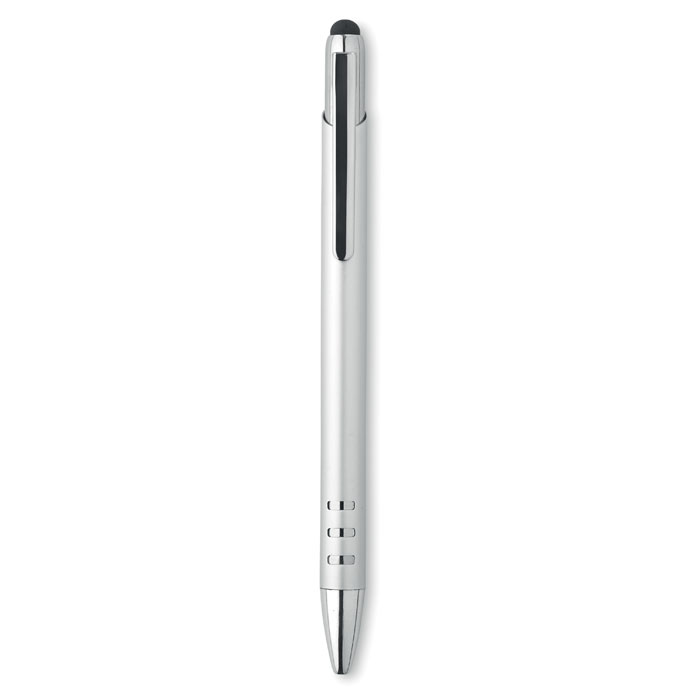 Aluminiowy przekręcany długopis z błyszczącymi chromowanymi elementami. Wyposażony w miękką końcówkę do ekranów dotykowych. Niebieski tusz.