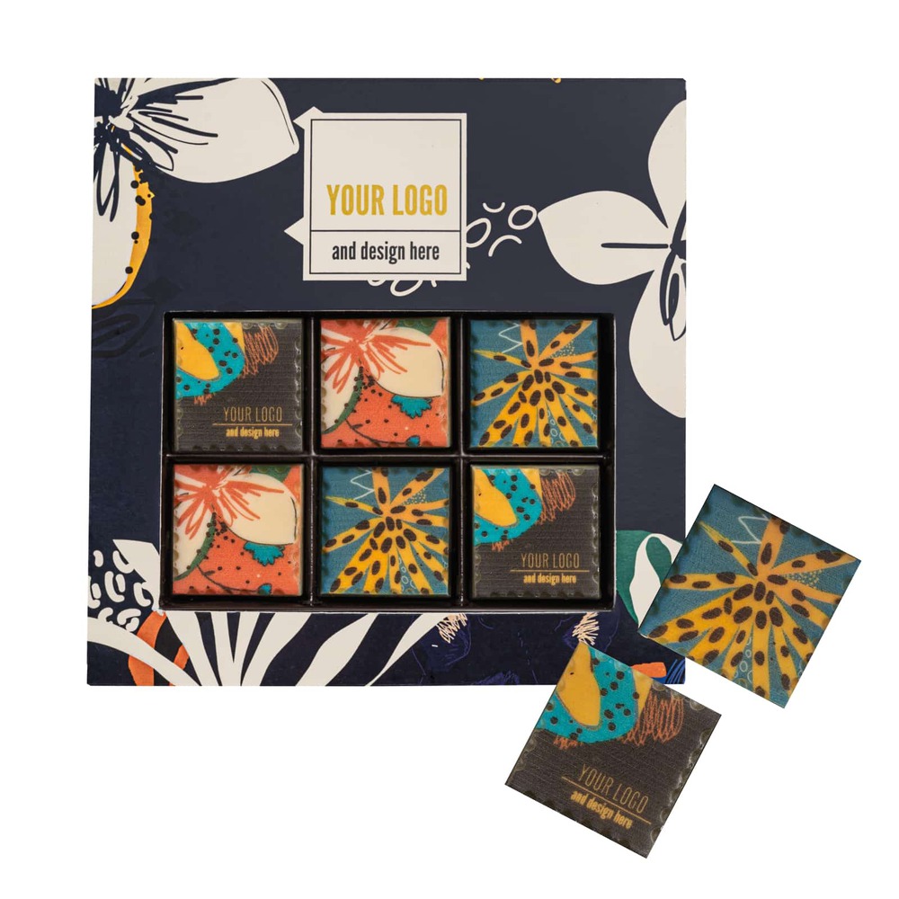 Aż 6 sztuk pralinek, wypełnionych autorskim nadzieniem na bazie białej czekolady z dodatkiem mielonych migdałów. Ich oryginalny kształt wzbogacony grafiką bezpośrednio na czekoladzie wyróżnia się na tle innych personalizowanych gadżetów reklamowych – zwłaszcza że na każdej pralince możesz umieścić inny projekt graficzny!
