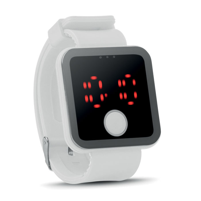 Zegarek z czerwoną diodą LED, wyposażony w silikonowy pasek, zapakowany w pudełko. Naciśnij przycis, a pojawi się godzina. Zegarek wyświetla godzinę, sekundy oraz datę.