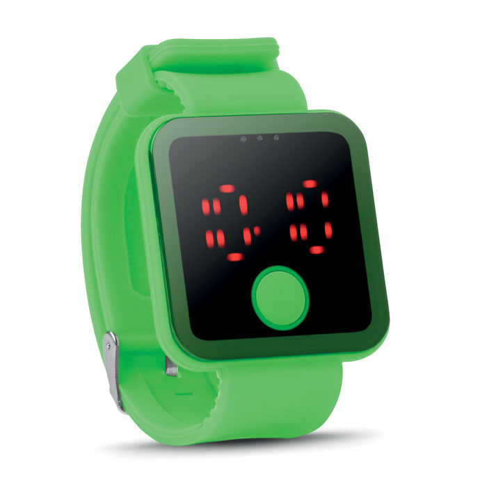 Zegarek z czerwoną diodą LED, wyposażony w silikonowy pasek, zapakowany w pudełko. Naciśnij przycis, a pojawi się godzina. Zegarek wyświetla godzinę, sekundy oraz datę.