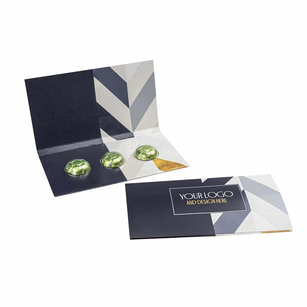 Zestaw 3 mini czekoladek w kształcie kwiatka zapakowanych w papierową kopertę, którą możesz dowolnie spersonalizować. Oto produkt doskonały do promocji Twojego katalogu!