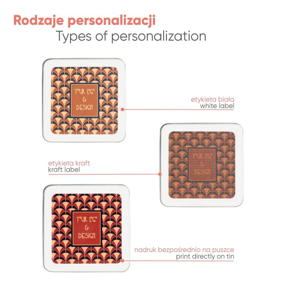 Dla Twojej wygody oferujemy dwa sposoby personalizacji produktu: możesz wybrać nadruk cyfrowy na etykiecie samoprzylepnej, na której umieścisz dowolną grafikę oraz nadruk cyfrowy uv bezpośrednio na puszce.