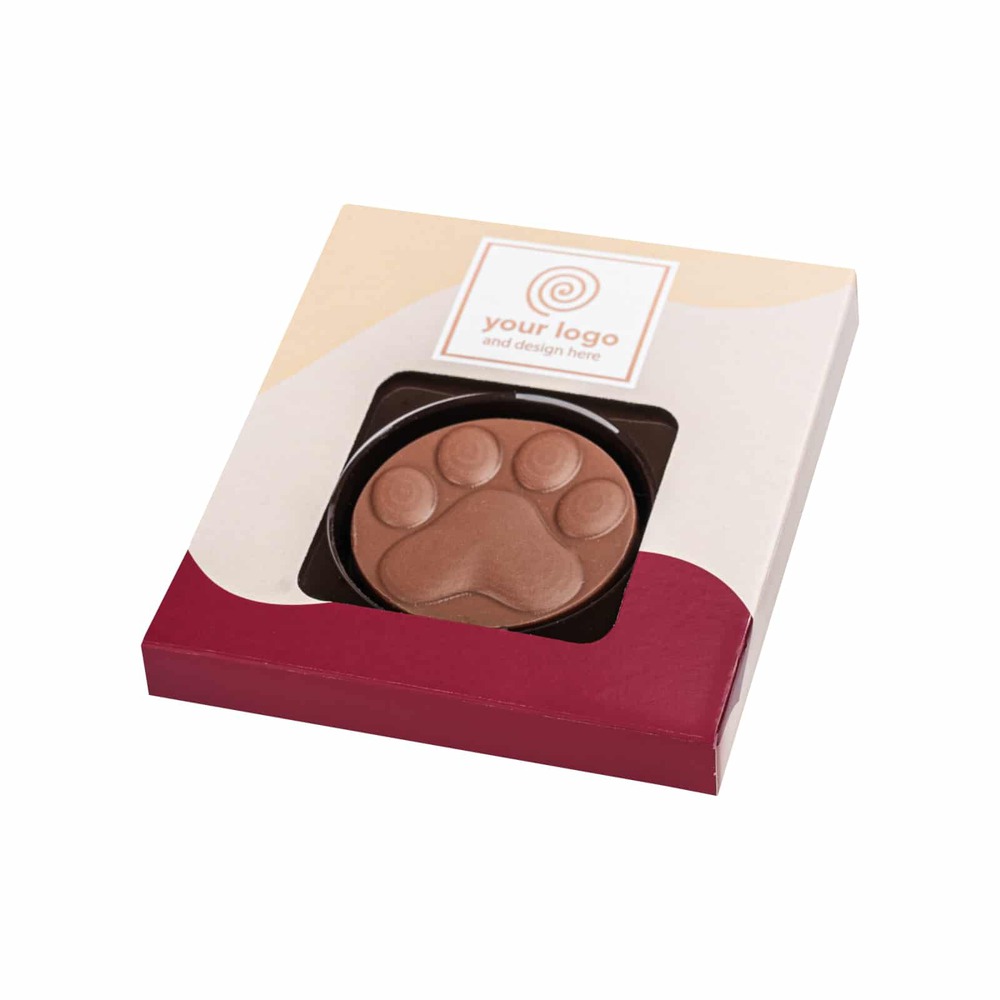 Na tej pysznej czekoladzie umieściliśmy tłoczenie uroczej zwierzęcej łapki. Włożyliśmy ją do pudełka wykonanego z papieru z certyfikatem fsc, które zapewnia możliwie największą powierzchnię zadruku – również wewnątrz opakowania! Dzięki nadrukowi cyfrowemu nie ma żadnych ograniczeń dotyczących liczby kolorów czy przejść tonalnych.