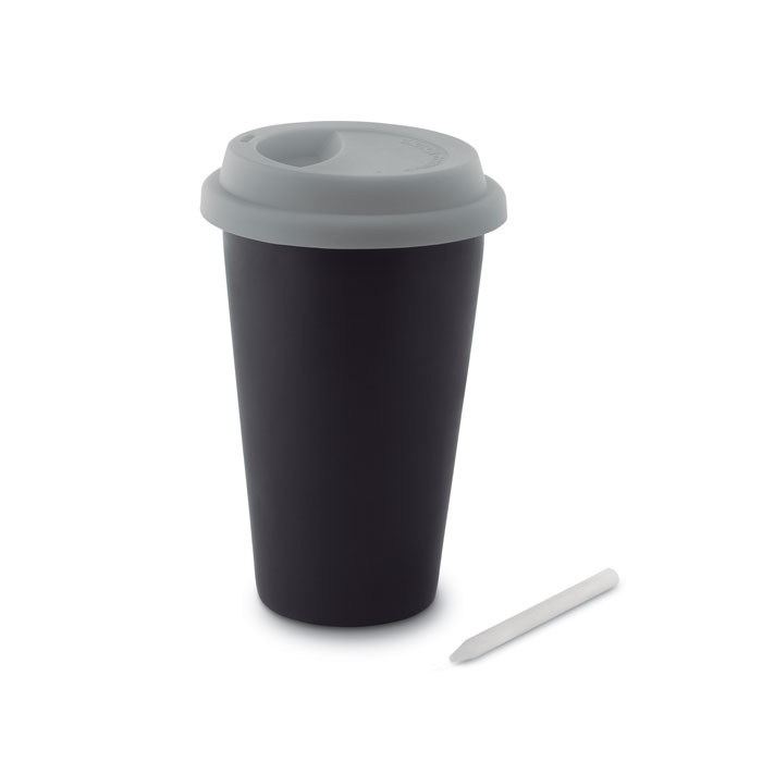Kubek ceramiczny z podwójnymi ściankami na których możesz pisać kredą. Zawiera pokrywkę silikonową. Pojemność 350ml.