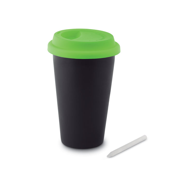 Kubek ceramiczny z podwójnymi ściankami na których możesz pisać kredą. Zawiera pokrywkę silikonową. Pojemność 350ml.