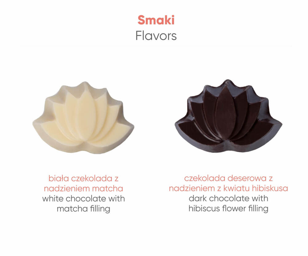 - czekolada deserowa (57% kakao) z nadzieniem hibiskusowym – intensywna czekolada deserowa uzupełniona lekko kwaskowym, owocowym akcentem kwiatu hibiskusa.