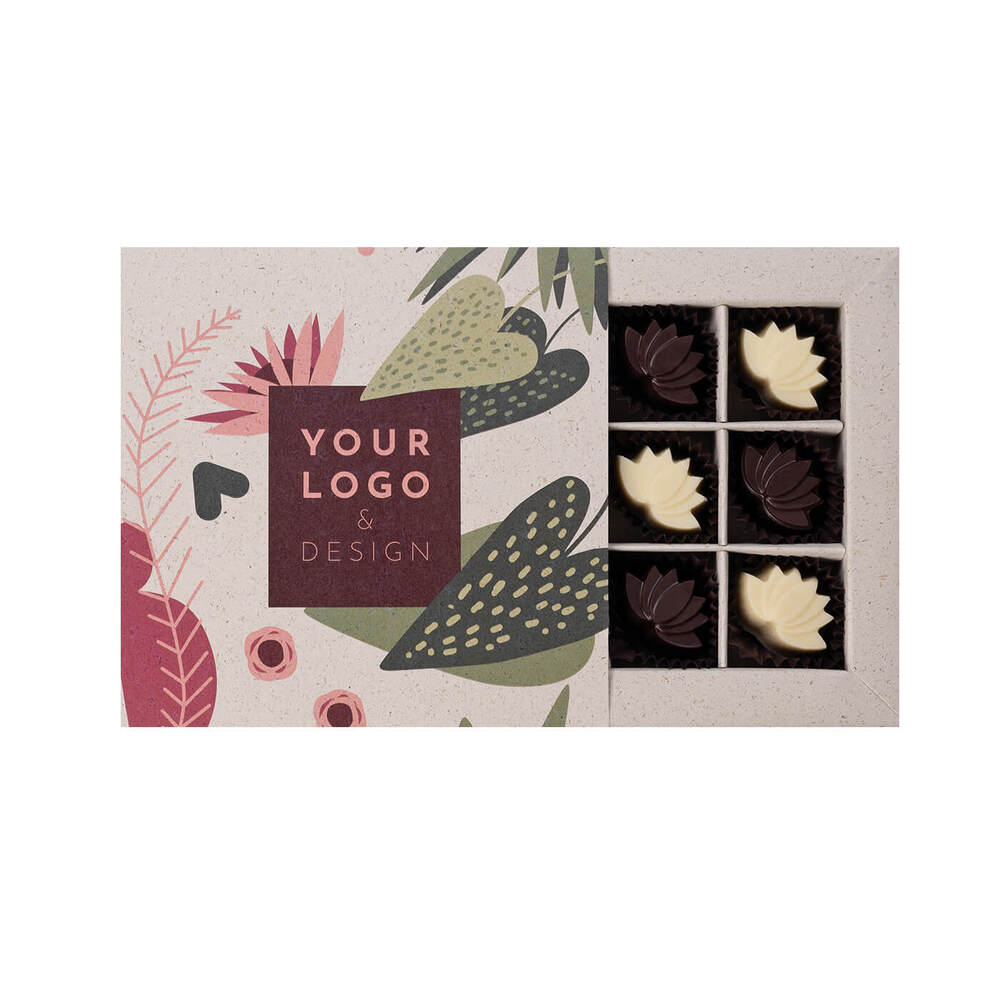 Pralinki harmony quartet są zapakowane w stylowe pudełko, które podkreśla luksusowy charakter produktu, jednocześnie pozostając w zgodzie z zasadami ekologii. Opakowanie zostało wykonane w całości z materiałów papierowych, bez użycia plastiku. Dodatkowo, możliwość wyboru rodzaju papieru – białego, kraftowego lub ecru z dodatkiem włókien trawy (najbardziej ekologiczna opcja) – pozwala dostosować design do charakteru Twojej marki.