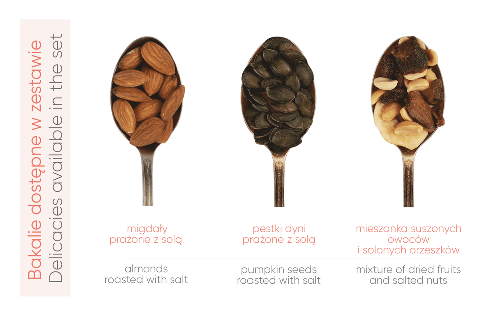 W zestawie znajdziemy pestki dyni prażone z solą, mieszankę suszonych owoców i solonych orzeszków oraz migdały prażone z solą.