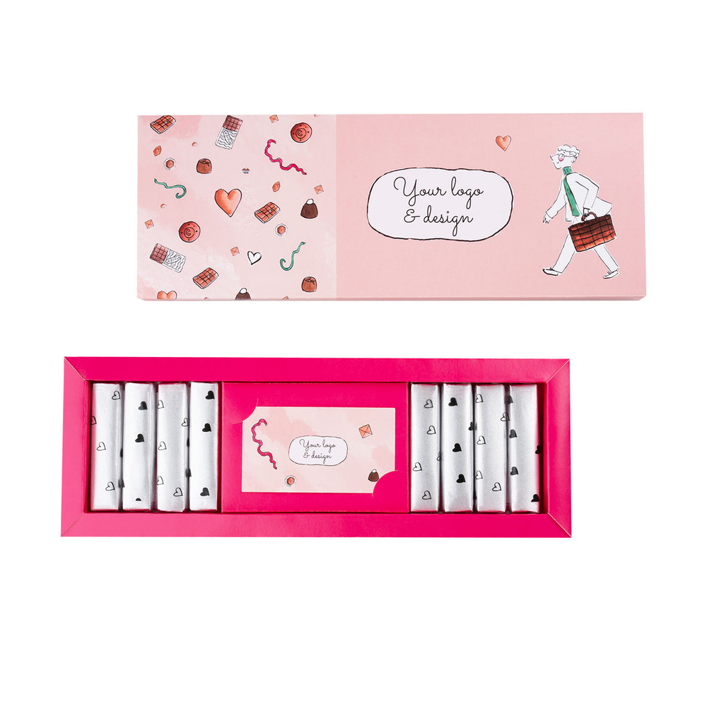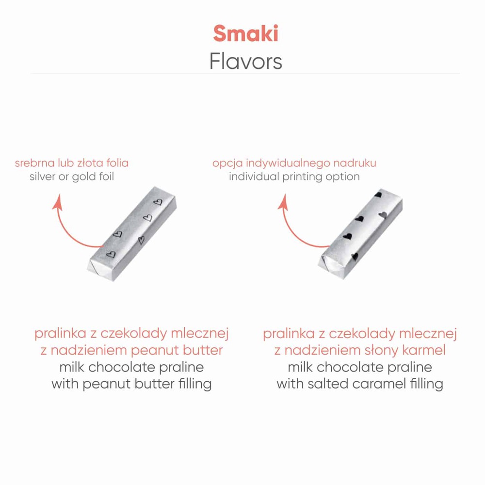 Praliny message box 8 szt są umieszczone w eleganckim opakowaniu, które można dostosować do własnych potrzeb. Możliwość personalizacji opakowania sprawia, że możesz umieścić na nim swoje logo, dowolną grafikę lub powitalną wiadomość, co czyni prezent skutecznym narzędziem marketingowym. Każda pralinka zapakowana jest indywidualnie w srebrną – do wyboru. Ponadto pralinka owinięta jest owijką z folii transparentnej zdobionej wzorem w serduszka – w dwóch wersjach w zależności od wersji smakowej.
