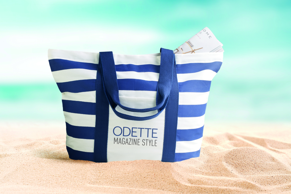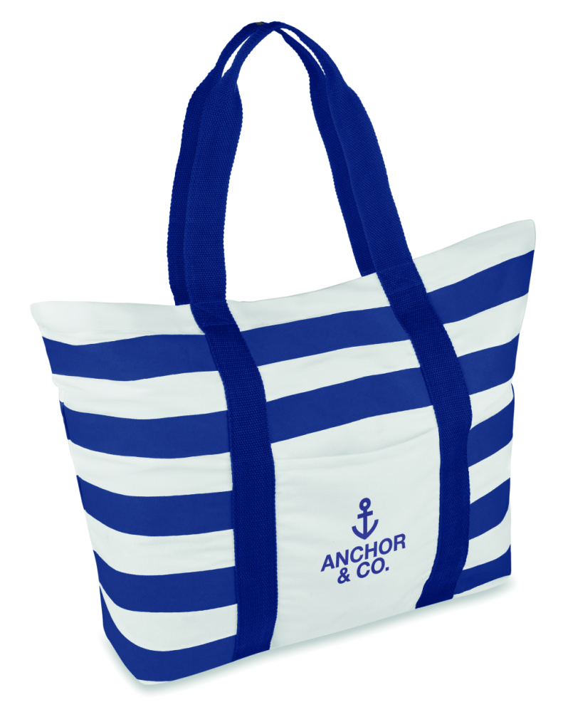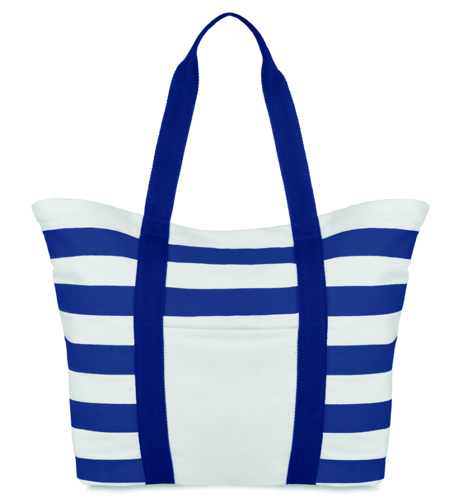 Torba plażowa w paski z płótna. Posiada podszewkę i wewnętrzną kieszonkę na zamek