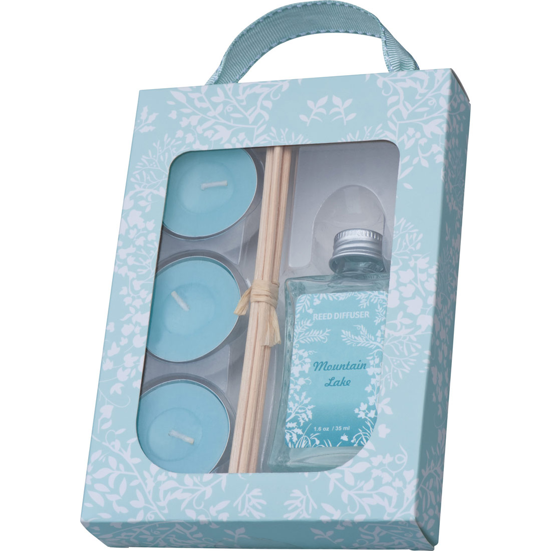 Kuszące zapachy w praktycznym zestawie, na który składają się trzy świeczki i odświeżacz powietrza z drewnianymi patyczkami. Masz wybór pomiędzy zapachem Mountain Lake (świeży z nutą ziół) lub Vivid Violet (łagodny i odświeżający). Twoje logo może zostać wydrukowane i naklejone na opakowaniu. Grupa nadruku: ET
