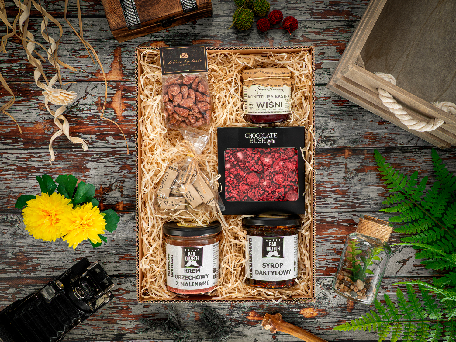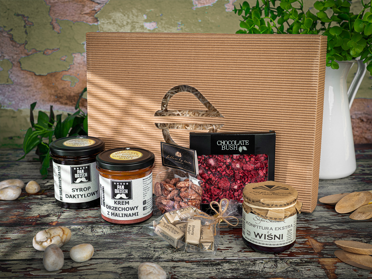 Minimalna ilość zamówienia 100 szt. Owocowy raj to paczka pełna naturalnych smaków, idealna dla smakoszy! Zawiera konfiturę extra z wiśni (200 g), mleczną czekoladę z liofilizowanymi malinami (85 g), syrop daktylowy (400 g), krem orzechowy z malinami (300 g), miodowe krówki (70 g) oraz prażone orzechy nerkowca (70 g). Całość zapakowana w eleganckie opakowanie, gotowa na prezent lub do delektowania się!