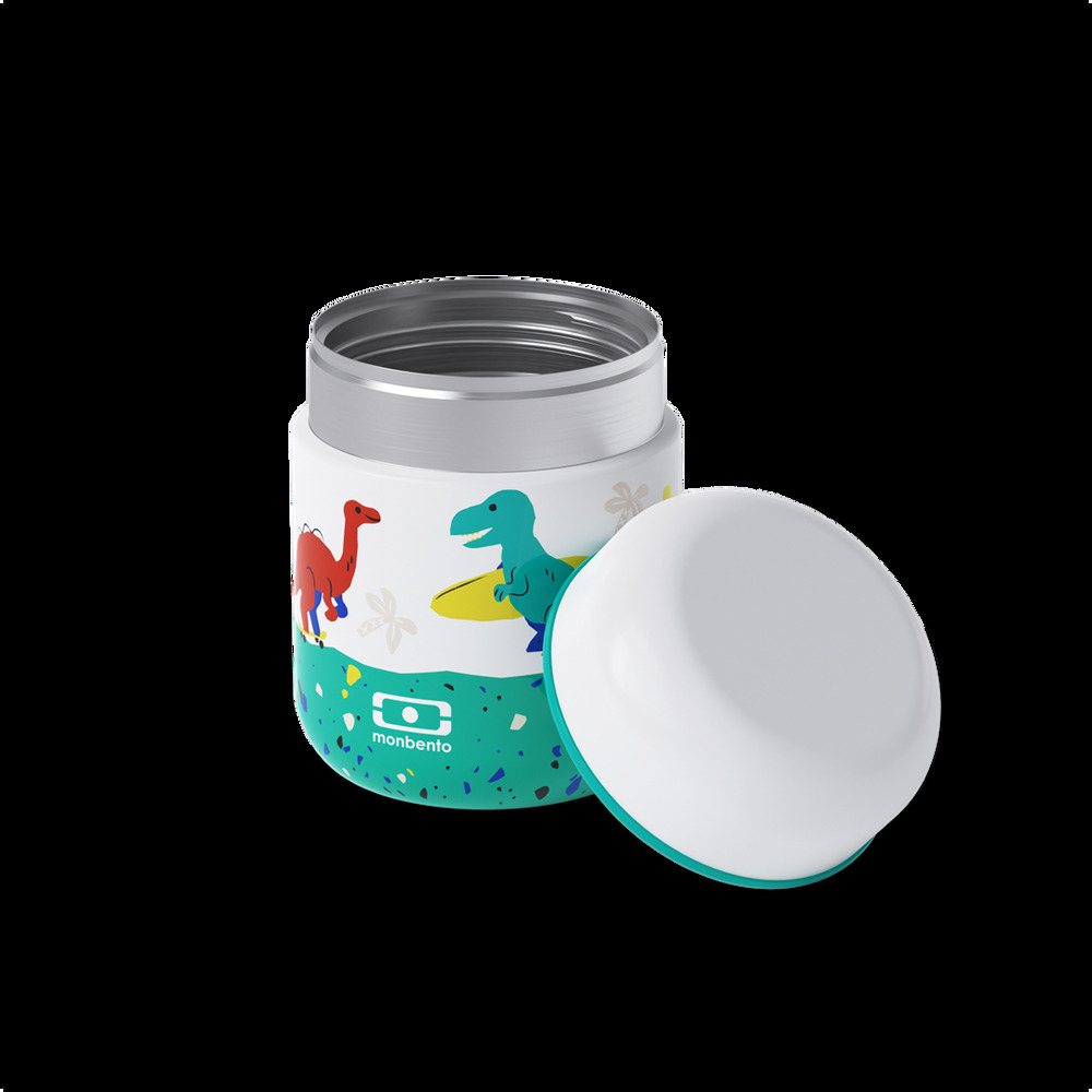 Monbento Capsule Graphic Dino to termos obiadowy dla dzieci z motywem dinozaura. Wykonany ze stali nierdzewnej z podwójnymi ściankami izolowanymi próżniowo, utrzymuje temperaturę posiłków przez wiele godzin.