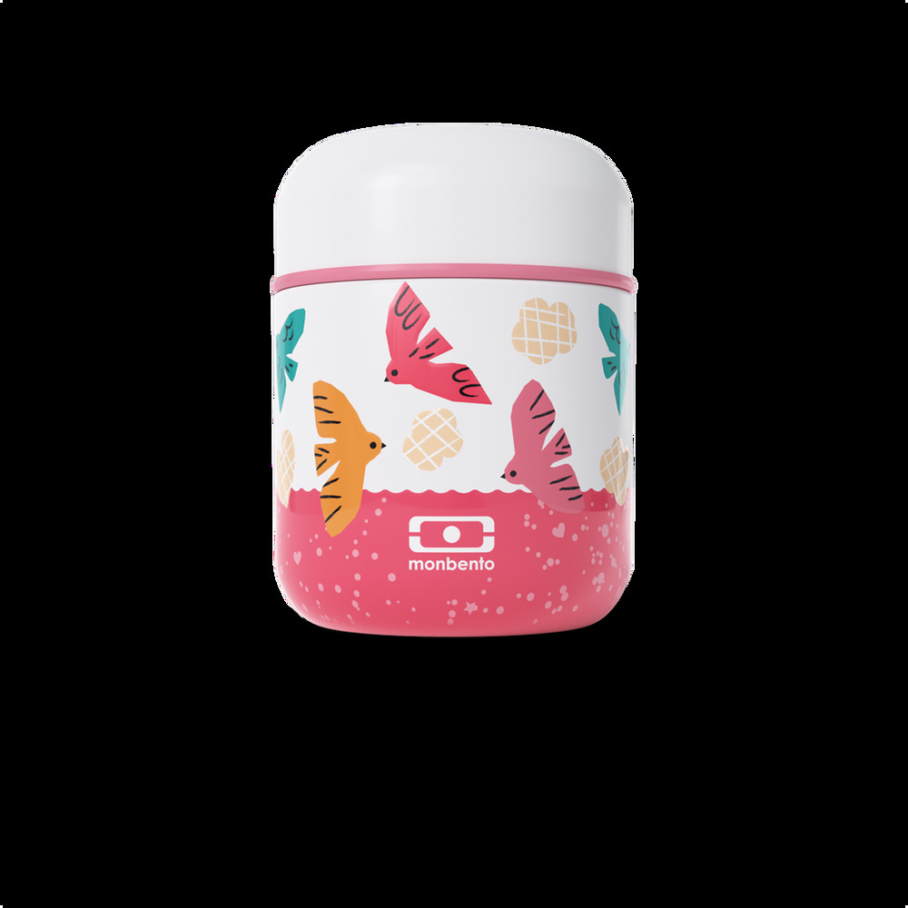 Monbento Capsule Graphic Birds to termos obiadowy dla dzieci z uroczym motywem ptaszków. Wykonany ze stali nierdzewnej z podwójnymi ściankami izolowanymi próżniowo, utrzymuje temperaturę posiłków przez wiele godzin.