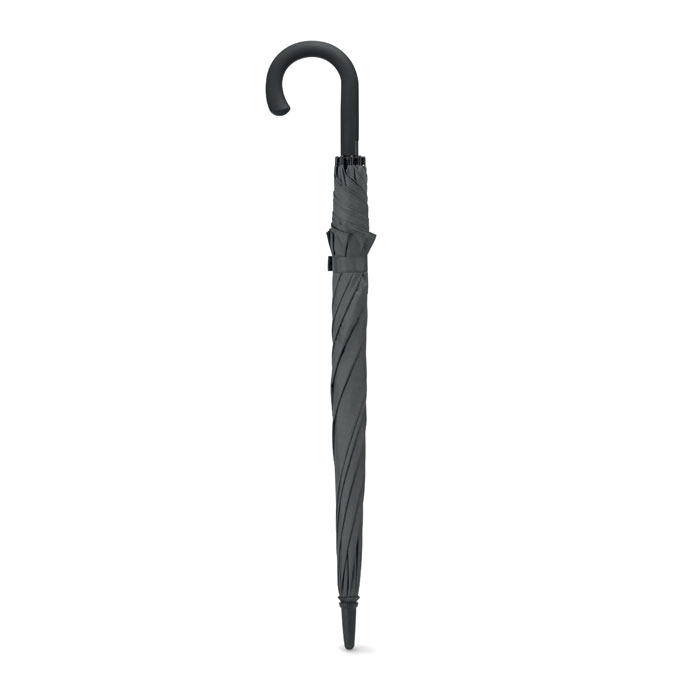 Elegancki 23 calowy parasol automatyczny odporny na działanie silnego wiatru wykonany z tkaniny 190T. Trzon czerniony, żebra wykonane z włókna szklanego, zakończenia plastikowe. Zakrzywiona rączka z gumowanego plastiku. Zapięcie manualne.