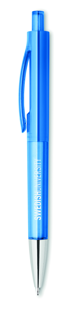 Przyciskany długopis w przezroczystej obudowie ABS, z błyszczącą końcówką. Niebieski tusz.