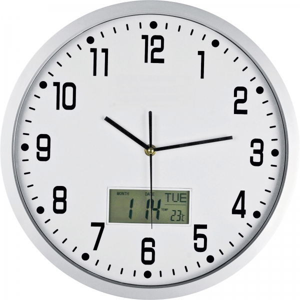 Zegar ścienny CrisMa to połączenie nowoczesnej technologii i eleganckiego designu, które sprawia, że jest to doskonały wybór do każdego biura, salonu czy biura. Ten analogowy zegar ścienny wyróżnia się dużym, cyfrowym wyświetlaczem, który nie tylko pokazuje dokładny czas, ale również wyświetla datę, dzień tygodnia oraz temperaturę. Dzięki temu jest to urządzenie niezwykle funkcjonalne, które spełnia więcej niż tylko jedną rolę - nie tylko wskazuje godzinę, ale także dostarcza dodatkowych, cennych informacji na temat dnia i otoczenia.Zegar CrisMa łączy estetykę z praktycznością. Jego klasyczna tarcza jest idealnym tłem dla nowoczesnego wyświetlacza, co sprawia, że zegar wpasowuje się w wiele różnych stylów wnętrz. Dzięki temu zegar nie tylko pełni funkcję użytkową, ale również stanowi elegancki element dekoracyjny. Zintegrowany panel reklamowy pozwala na umieszczenie logotypu firmy lub innej grafiki pod ochronną szybką, co czyni go doskonałym wyborem na prezent reklamowy, upominek firmowy lub element wyposażenia przestrzeni biurowych i publicznych. Zegar może stać się doskonałym nośnikiem reklamy, przyciągającym uwagę i jednocześnie użytecznym w codziennym użytkowaniu.Zegar CrisMa cechuje się również dużą czytelnością dzięki wyraźnym cyfrom, które sprawiają, że odczytanie godziny, daty czy temperatury jest niezwykle łatwe, nawet z większej odległości. To szczególnie istotne w biurach, halach produkcyjnych czy innych przestrzeniach, gdzie szybkość i precyzja mają kluczowe znaczenie.Wykonanie z solidnych materiałów zapewnia długowieczność i odporność na uszkodzenia, dzięki czemu zegar będzie służył przez długie lata, zachowując swój elegancki wygląd i pełną funkcjonalność. Zegar jest zasilany baterią oraz łatwy w montażu i obsłudze.Zegar ścienny CrisMa to doskonały wybór, który łączy funkcjonalność z estetyką, stanowiąc nie tylko pomocny element wyposażenia, ale również skuteczne narzędzie reklamowe. Z jego pomocą nie tylko zadbasz o czas i temperaturę w swoim wnętrzu, ale także z powodzeniem zaprezentujesz logo swojej firmy.