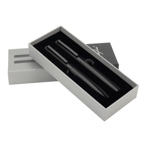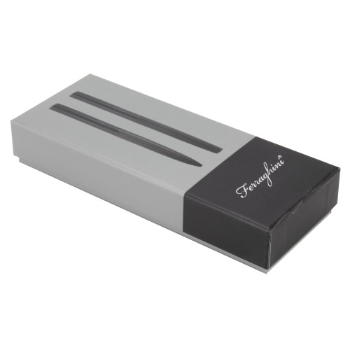 Elegancki zestaw piśmienniczy marki Ferraghini to wyjątkowy duet długopisu i pióra kulkowego, stworzony z myślą o najbardziej wymagających klientach biznesowych. Oba artykuły piśmiennicze wykonane są z wytrzymałego metalu, a ich prążkowana powierzchnia dodaje im niepowtarzalnego charakteru oraz pewności chwytu. Zarówno długopis, jak i pióro kulkowe piszą na niebiesko. Stylowa klasyczna czerń, uzupełniona o subtelne wykończenia, czyni ten zestaw idealnym upominkiem dla osób ceniących estetykę, wytrzymałość i unikatowy design.