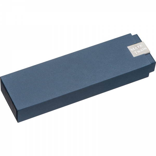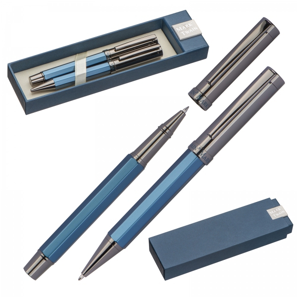 Elegancki zestaw piśmienniczy marki Mark Twain to połączenie klasyki i nowoczesnego designu. Składający się z długopisu i pióra kulkowego, zestaw ten wykonany jest z solidnego metalu, co nadaje mu odpowiedni, zbalansowany ciężar i trwałość. Korpusy o unikalnym sześciokątnym kształcie świetnie leżą w dłoni, zapewniając wygodę podczas pisania. Oba artykuły piśmiennicze piszą na niebiesko, a ich lekko połyskująca, błękitna powłoka dodaje szyku. Eleganckie, ciemne chromowane akcenty w strefie uchwytu i przy klipsach podkreślają prestiżowy charakter tego wyjątkowego zestawu, idealnego na prezent biznesowy.