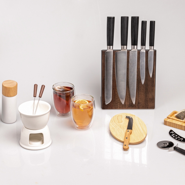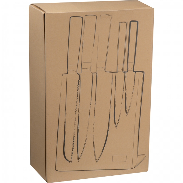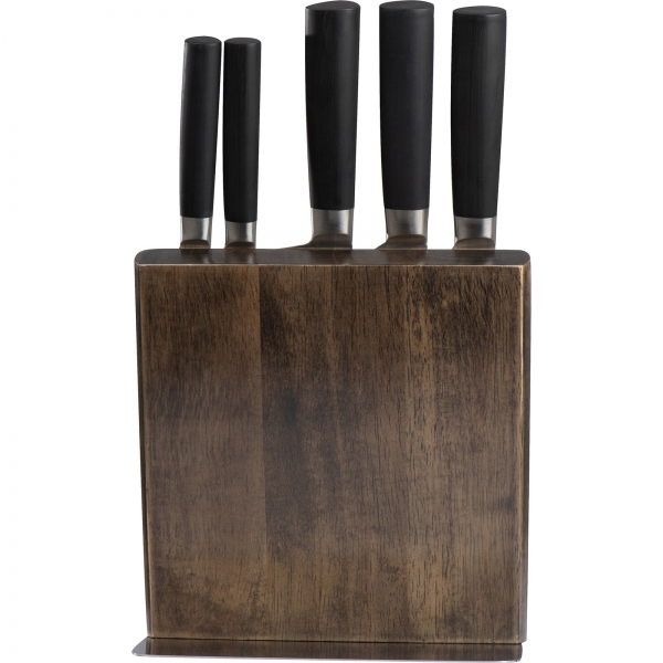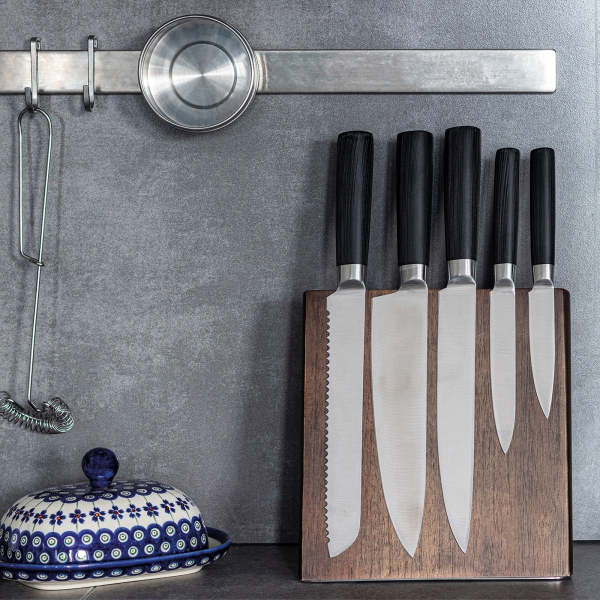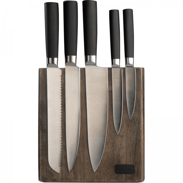 Zestaw pięciu noży kuchennych to idealne narzędzie dla każdego kucharza. Noże wykonane są z wysokiej jakości stali nierdzewnej, co gwarantuje ich trwałość oraz 100% bezpieczeństwo w kontakcie z żywnością. Dzięki starannemu wykończeniu, noże doskonale sprawdzają się przy krojeniu i szatkowaniu, a ich ostrość zapewnia precyzyjne cięcie każdego rodzaju produktów. Ich dodatkowym atutem jest innowacyjne rozwiązanie drewnianego stojaka z wbudowanym magnesem wewnątrz drewna, które sprawia, że noże stabilnie trzymają się na swoim miejscu, co ułatwia ich szybki dostęp i organizację. To idealny gadżet dla branży gastronomicznej, hotelarskiej i nie tylko. Dzięki zamieszczonej na stojaku metalowej plakietce, na stojaku można zamieścić logo dowolnej marki, by dyskretnie promować firmę.