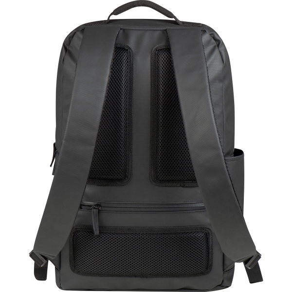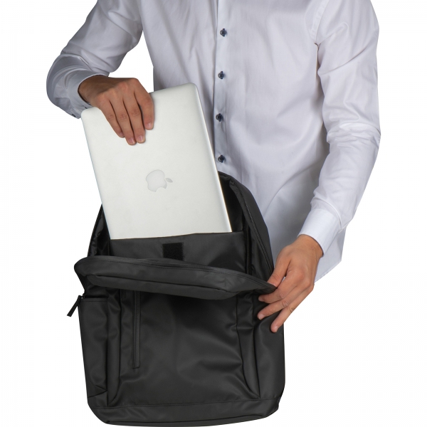 Wysokiej jakości plecak wykonany z trwałego i wodoodpornego materiału 600 DPU, idealnie nadaje się do codziennego użytku, zarówno w pracy, jak i podczas podróży. Dzięki wzmacnianym, oddychającym szelkom zapewnia komfort noszenia nawet podczas długiego użytkowania. Plecak wyposażony jest w boczną i wewnętrzną kieszeń, które umożliwiają przechowywanie drobnych przedmiotów oraz przegródkę antykradzieżową, gwarantującą bezpieczeństwo cennych rzeczy. Pomieści laptopy do 15,8 cala, co czyni go doskonałym wyborem dla osób potrzebujących funkcjonalności i stylu w jednym. Dzięki jednolitej kolorystycznie, czarnej powierzchni plecak ten stanowi doskonałą przestrzeń na estetyczny nadruk reklamowy - nadaje się jako pole na skomplikowany projekt lub miejsce na dyskretny logotyp - co czyni go idealnym gadżetem promocyjnym.