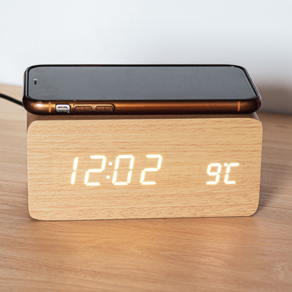 Elegancki zegar na biurko, wykonany z połączenia drewna i tworzywa sztucznego. To stylowy i funkcjonalny dodatek do każdego miejsca pracy. Jego podświetlany wyświetlacz wyraźnie wskazuje godzinę oraz aktualną temperaturę powietrza, dzięki czemu zawsze będziesz na bieżąco z czasem i warunkami w pomieszczeniu. Zegar wyróżnia się również innowacyjną funkcją bezprzewodowego ładowania - wystarczy położyć telefon na jego powierzchni, aby rozpocząć ładowanie. To rozwiązanie idealnie wpisuje się w potrzeby nowoczesnego biura, eliminując konieczność korzystania z dodatkowych kabli. Ten zegar to nie tylko praktyczny gadżet, ale również dobry nośnik reklamy, na którego powierzchni możesz umiejscowić logo firmy.