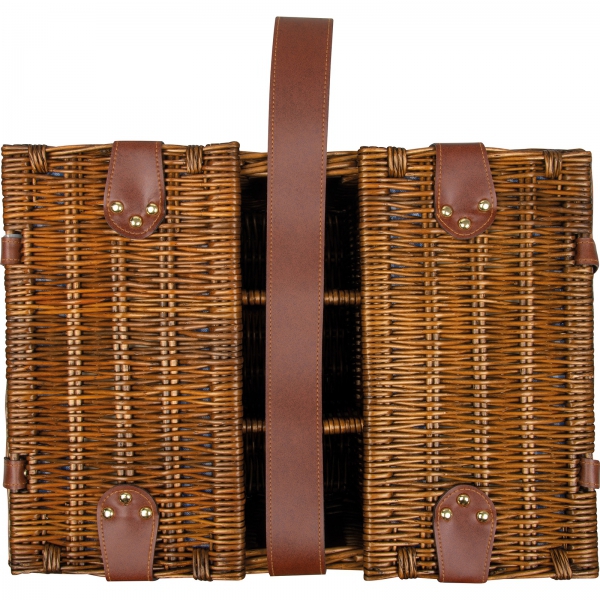Elegancki wiklinowy kosz piknikowy dla czterech osób – idealny na rodzinne wypady i spotkania na świeżym powietrzu. W zestawie znajdują się cztery porcelanowe talerze, szklanki, serwetki oraz komplet sztućców (12 elementów). Dodatkowo wyposażony w solniczkę i pieprzniczkę, nóż kelnerski oraz trzy przegródki na butelki.Praktyczna, wbudowana przegroda chłodząca pomaga utrzymać świeżość produktów, a solidna konstrukcja zapewnia wygodę użytkowania. Doskonały wybór dla miłośników stylowych i ekologicznych rozwiązań.
