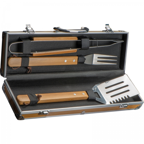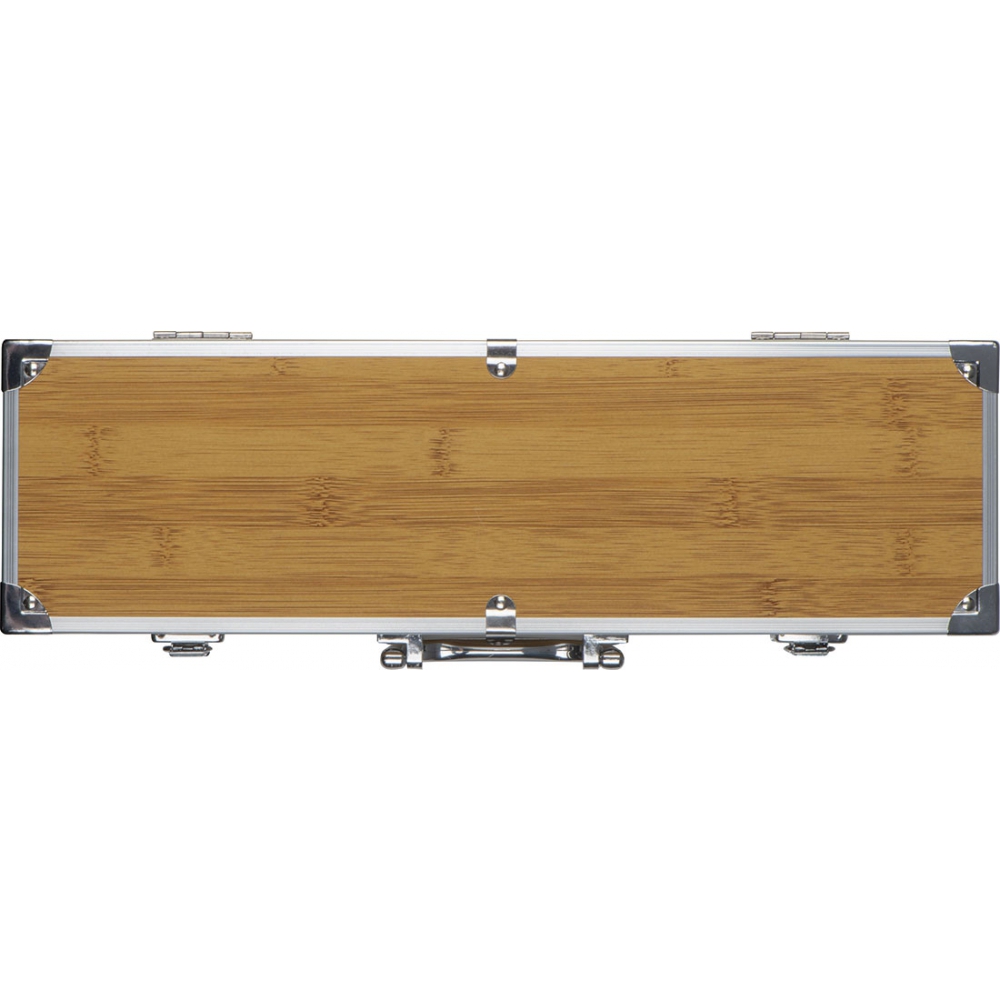 Elegancki i funkcjonalny 3-częściowy zestaw do grilla w poręcznej walizce ze wstawkami z bambusa, łączy w sobie wygodę i styl. W skład zestawu wchodzą szczypce, widelec do mięsa oraz szpatułka, które idealnie nadają się do przygotowywania dań na grillu. Każdy element zestawu wyposażony jest w bambusowe rączki, które nie tylko dodają elegancji, ale również pozostają chłodne podczas użytkowania, co zwiększa bezpieczeństwo. Wysokiej jakości materiały, z których wykonane są narzędzia, zapewniają ich trwałość i wielokrotne użycie, a także ułatwiają utrzymanie w czystości. Do zestawu dołączone jest dedykowane etui, które ułatwia przechowywanie i transport, sprawiając, że cały zestaw jest idealnym wyborem dla miłośników grillowania.
