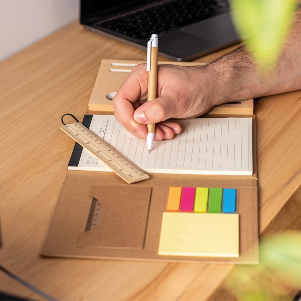 Folder z notatnikiem w linie i przyborami do pisania to wszechstronny zestaw, który łączy funkcjonalność z ekologicznym podejściem. Podwójnie składany folder wykonany z tektury, zamykany na gumkę, oferuje wszystko, czego potrzebujesz do efektywnego pisania i organizowania notatek. W środku znajduje się 80-stronicowy notes w linie, a także 20 kolorowych samoprzylepnych karteczek w 5 różnych kolorach, które ułatwiają oznaczanie i organizowanie ważnych informacji. Zestaw zawiera również dwie linijki (w tym jedną drewnianą), długopis, drewnianą temperówkę, gumkę do ścierania oraz dwa ołówki.To idealne rozwiązanie zarówno do biura, jak i na prezent dla osób ceniących porządek i wygodę w codziennej pracy.