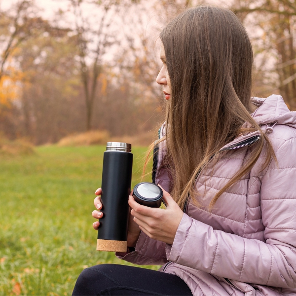 Termos o pojemności 450 ml to połączenie elegancji, funkcjonalności i dbałości o środowisko. Wykonany ze stali nierdzewnej, wyposażony w podwójne ścianki z izolacją próżniową, skutecznie utrzymuje temperaturę napojów - gorące napoje pozostają ciepłe do 8 godzin, a zimne zachowują swoją temperaturę nawet przez 12 godzin. Dzięki szczelnemu zamknięciu termos jest w pełni nieprzeciekający, co zapewnia komfort użytkowania w każdych warunkach.Jego minimalistyczny, stylowy design podkreśla korkowe dno, które nie tylko dodaje mu estetycznego uroku, ale także zapewnia stabilność i chroni powierzchnie przed zarysowaniami. Wykorzystanie materiałów przyjaznych dla środowiska sprawia, że termos to ekologiczna alternatywa dla jednorazowych kubków i plastikowych butelek.Lekki i poręczny, idealnie sprawdzi się w pracy, na uczelni, w podróży czy podczas aktywnego dnia na świeżym powietrzu. Wykonany z bezpiecznych materiałów przeznaczonych do kontaktu z żywnością, jest wolny od szkodliwych substancji i spełnia najwyższe standardy jakości. Termos o pojemności 450 ml to doskonały wybór dla osób, które cenią praktyczność, trwałość oraz styl w jednym produkcie.