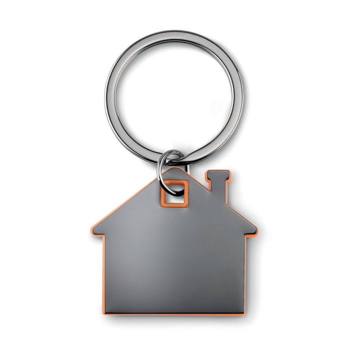 Brelok na klucze w kształcie domku, wykonany ze stali nierdzewnej oraz ABS.