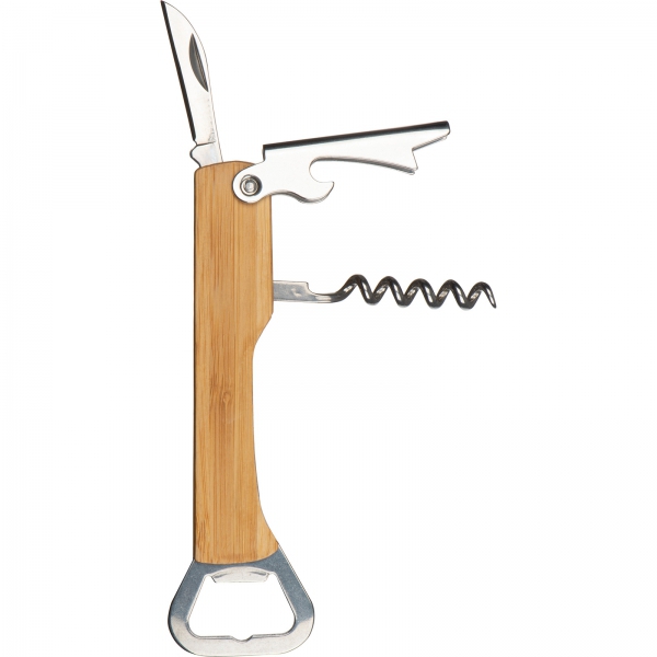 Nóż kelnerski to eleganckie i wszechstronne narzędzie, które zawiera wszystko, co potrzebujesz do podania alkoholu. Gadżet ten składa się z dwóch otwieraczy do kapsli, korkociągu oraz z nożyka służącego do zrywania owijki z szyjki butelki. Wszystkie elementy narzędziowe zostały wykonane z wysokiej jakości stali nierdzewnej, dzięki czemu gadżet ten jest trwały i sprawdzi się w codziennym użytkowaniu. Dodatkowym atutem noża kelnerskiego jest ergonomiczna, przyjemna w dotyku rączka, wykonana z drewna bambusowego, które nie tylko stylowo wygląda, ale również zapewnia dobry chwyt. Idealny dla restauratorów, sommelierów oraz miłośników wina, którzy cenią sobie zarówno funkcjonalność, jak i estetykę.