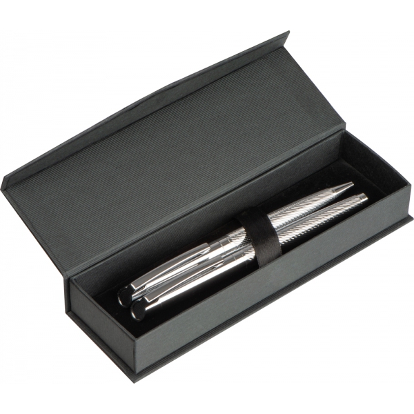 Stylowy zestaw piśmienniczy umieszczony w etui z magnetycznym zamknięciem w kolorze czarnym. Wewnątrz pudełka znajdziemy pióro kulkowe i metalowy długopis z przekręcanym mechanizmem. Oba te elementy wykonane są z błyszczącego, chromowanego metalu, który przykuwa uwagę i nadaje zestawowi wyjątkowego charakteru. Strefa chwytu jest prążkowana, dzięki czemu nie tylko pięknie i oryginalnie się prezentuje, ale również całość zapewnia pewny, stabilny chwyt. Zestaw ten nada dla najbardziej wymagających użytkowników - zarówno jako luksusowy prezent biznesowy, jak i uniwersalny prezent dla każdego. Długopis i pióro pozostawiają na papierze precyzyjne i płynne linie, a wkłady są koloru niebieskiego.